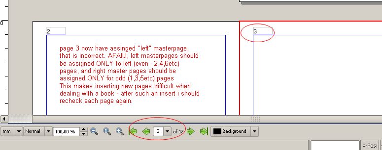 | Steps To Reproduce | 1. open the attached sla. Pls note page numbers in the top of the pages: odd numbers comes from masterpage named "1", and even numbers come from masterpage named "2". Everything is ok, like in a normal book. 2. Now insert ONE page after page 1. 3. See result and attachment. Page 3 now become assigned masterpage "2" that is a "left" masterpage. Inserting pages should not break the numbering layout. AFAIU, right pages (1,3,5 etc) should be allowed to have ONLY right masterpages, and left pages (2,4,6 etc) only left ones. Else adding new pages into existing document makes a real pain: after such an insert page numbering layout is broken. | ||||