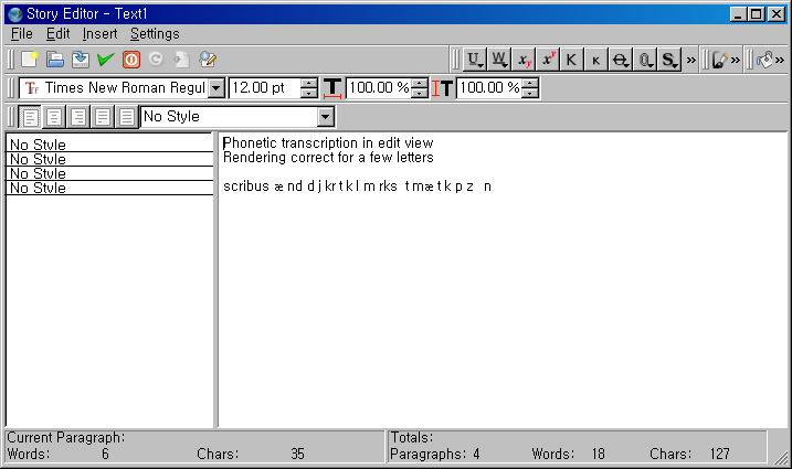 Image upload 1. IPA diacritics and a few symbols are not rendered correctly. Please fill in the platform info. Platform field is blank. Should be Daokorea. OS field is blank. Should be Windows. OS Version field is blank. Should be XP. However, these letters are found on Doulos SIL: U+026A LATIN LETTER SMALL CAPITAL I (in Doulos SIL, not in Times New Roman) U+0251 LATIN SMALL LETTER ALPHA (in Doulos SIL, not in Times New Roman) U+0259 LATIN SMALL LETTER SCHWA (in Doulos SIL and Times New Roman) U+0283 LATIN SMALL LETTER ESH (in Doulos SIL, not in Times New Roman) |