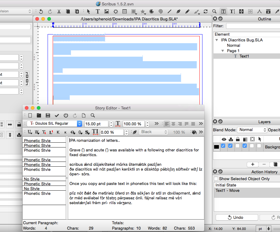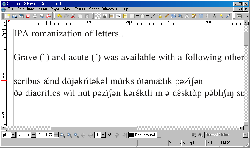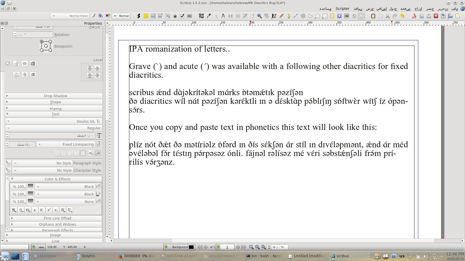 | Description | You tried testing Scribus with IPA transcription of the diacritics are not positioned correctly without "Mark to Mark Positioning" feature. When you create a new paragraph style named "Phonetic Style" and then transliterate text into IPA, the word "Scribus" was not recognized and the diacritics aren't positioned correctly. | ||||