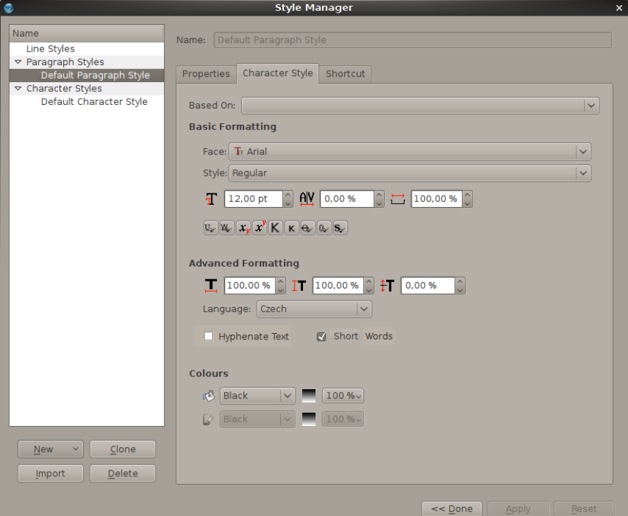 I think the best solution would be all settings to be only in preferences and Document Setup. In character style dialog would be only two check marks more. One for Hyphenate Text and the second one for Short Words. Please see picture above. In Document Setup and Preferences would be both - Hyphenation and ShortWords (now it is only in preferences). Hyphenator would have "styles" according to languages - one language - one hyphenator settings with all exceptions etc. And yes...there are some missing features such as number of glyphs before and after the hyphen and prohibition of hyphenation of the last word of page. To the yesterday discussion about manually and automatically add unbreakeble space: The behaviour would be the same like sub and superscripts. I don't see any problem here. |
