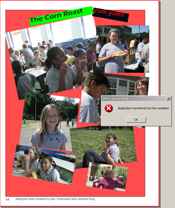| Description | When trying to export a complete 8.5 X 11 inch page with a solid colour background and seven 300 dpi images plus 2 text fields with colour backgrounds, I get the following message:"JPEG Library Error - application transfered too few scanlines" in a text box (please see attached JPEG for image). The application creates an exported file but the resulting JPEG is incomplete, usually missing one or more images. | ||||