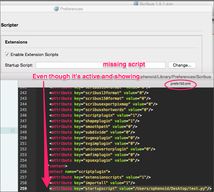 | Additional Information | Update: 1) File -> Preferences -> Scripter does not show the current startup script instead it shows an empty "Startup Script" field even if a startup script is set. 2) that Scribus with the GUI silently fails if the startup script is not found 3) as stated in # 2, the console tells us nothing either 4) attribute key="startupscript" in prefs150.xml is indeed populated. | ||||