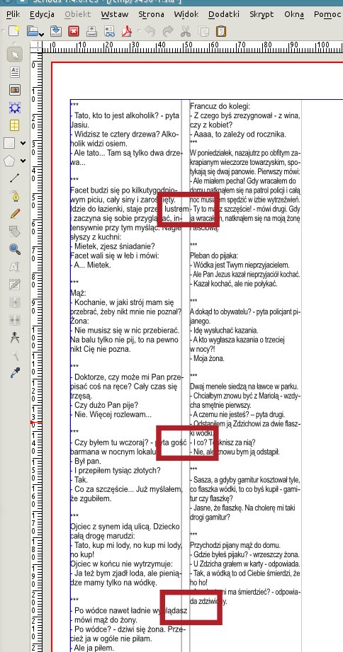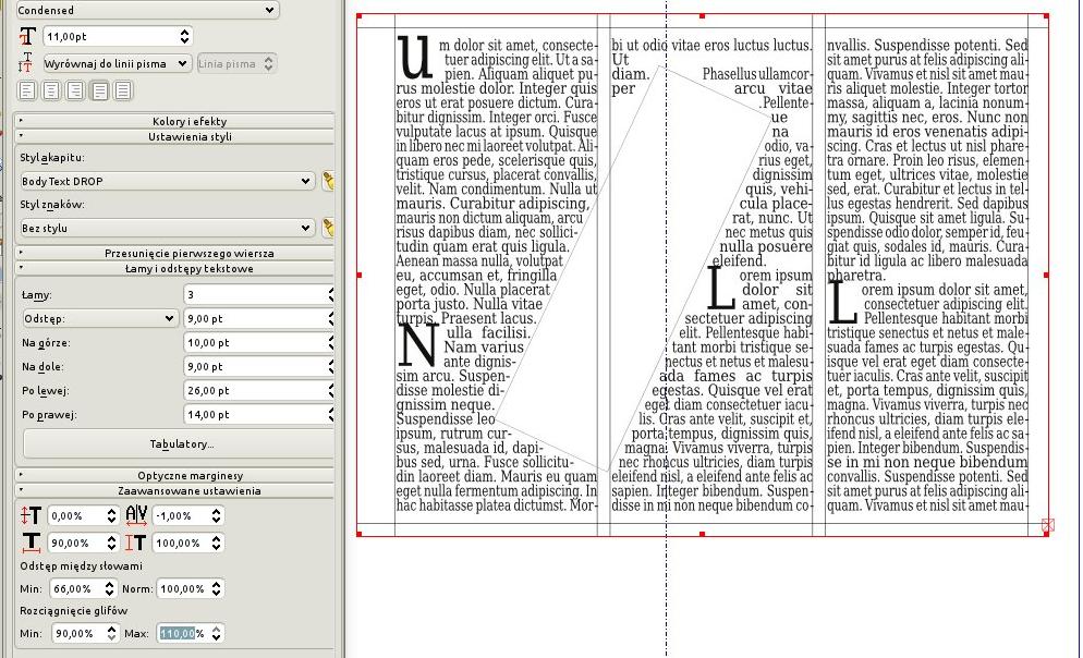 Small issue was a big elephant... But now I can introduce you new patch fixing all biggest formatting issues: - text extending margins - unwanted adds of text indents and margins to overflow areas - parts of glyphs in overflow areas (when edge is not 0 angle to text) and few smaller formatting issues I have found during preparing that solution. BTW I have found that formatting using integer coordinates of glyphs and page items positions can gives us low quality of it (for example 0009902 may be that kind of bug - to low precision) I know - changing whole computing to floating precision can be deadly solution for machines with low computing power, but maybe it could be set in preferences and user will decide what is his goal - comfortable speed or best quality. |