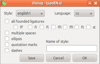 | Description | Create Typo script - replace characters by ligatures - delete multiple spaces - three dots replace by elipsis - replace " and ' by proper quotation marks - replace hyphen by dash (only with spaces on the both sides) - add possibility to create "styles" for script | ||||