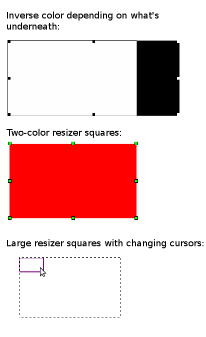 Well, it's hard for me to make reasonable proposals, as I'm unfamiliar with how to code any of this, but few scenarios come to mind (see attached image for visual examples): 1) Make the resizing squares of color that is inverse of whatever is under the square - this is how MS Word does it (first example in the image). 2) Make the two-color resizing squares - this is how Open Office does it (second color would be the outline; second example in the pic) 3) Make large resizing squares that are just outlines, not filled with color; when user hovers over a specific resizer, the cursor would change - this is how Gimp does it (third example in the pic, although the cursor is normal, in the actual app it changes to be an arrow pointing West-North) 4) Lastly, a somewhat convoluted example I already mentioned, have a key combination that would enable alternative (high visibility?) coloring of the resizers - the user would choose two colors and have the ability to enable one or the other with a key combination. P.S.: the color setting doesn't seem to work for me for new documents either :/ |